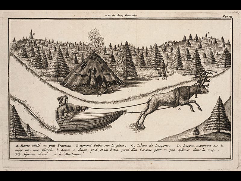 Outhier published all his observations in a narrative, Journal d'un voyage au nord, en 1736. & 1737 (1744; sixth image). It has a number of large folding engravings, including one that depicts a reindeer pulling a pulkka, with a Sami tent and a Sami on skis in the background (first image). We were so impressed by this illustration, when we acquired Outhier's book in 2010, that we used it for the front of the Library's holiday card that very year (seventh image).