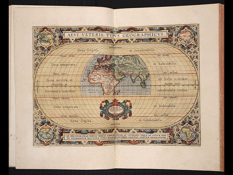 The second part of the Theatrum contained historical maps, depicting the world as known to ancient geographers, such as a map of the Roman Empire at its greatest extent (fourth image). One of the most arresting engravings in the Theatrum shows the world as mapped by Ptolemy of Alexandria, superimposed on the much larger world known to Ortelius (fifth image).