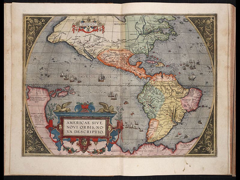 The Theatrum was an immediate publishing success, and it went through 23 editions and translations in Ortelius’ own lifetime (he died in 1598). It also made the previously poor Ortelius a great deal of money, which meant he could now afford to travel and collect geographical information and improve his maps. The Library’s copy of the Theatrum is the 1592 edition, considerably enlarged from that of 1570 (134 maps instead of 53). We reproduce above: the world map (considerably improved from that of 1570); a map of the New World (second image above); and the map of Iceland, charming because of the many ferocious sea beasties that fill the North Atlantic south of the island (third image).