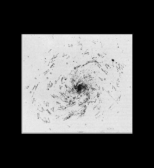 Van Maanen took photographs of various spirals, such as M33 and M81, and using a blink comparator (the same kind of instrument with which Clyde Tombaugh would soon discover Pluto), van Maanen claimed to detect the motion of individual stars. Above we see one of his stellar motion charts of M33, with the stellar velocities indicated by short arrows (first image). These motions were comparatively large, indicating that the spirals would complete a rotation in a fairly short time, a thousand years or so. Consequently, there was no way these spirals could be large and distant, or else the stellar velocities would be impossibly large. Van Maanen published papers in 1916 and 1921 and convinced most of the astronomical community that the island universe hypothesis was untenable. In the Great Debate of 1920 between Heber Curtis and Harlow Shapely on the nature of spirals, Harlow Shapley opposed Heber's island universe, citing van Maanen's measurements as evidence. And when, shortly thereafter, Edwin Hubble claimed that M31 was an external galaxy, far beyond the confines of the Milky Way Galaxy, van Maanen's rotation rates were used against Hubble.