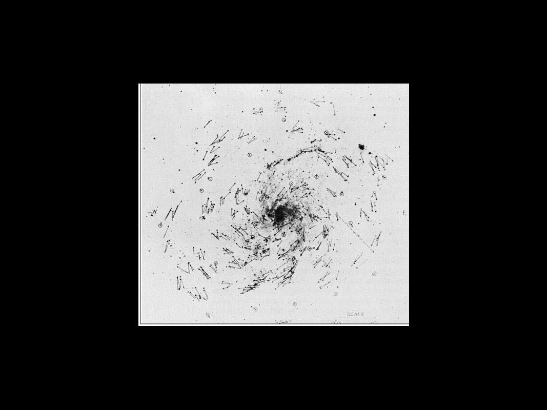 Van Maanen took photographs of various spirals, such as M33 and M81, and using a blink comparator (the same kind of instrument with which Clyde Tombaugh would soon discover Pluto), van Maanen claimed to detect the motion of individual stars. Above we see one of his stellar motion charts of M33, with the stellar velocities indicated by short arrows (first image). These motions were comparatively large, indicating that the spirals would complete a rotation in a fairly short time, a thousand years or so. Consequently, there was no way these spirals could be large and distant, or else the stellar velocities would be impossibly large. Van Maanen published papers in 1916 and 1921 and convinced most of the astronomical community that the island universe hypothesis was untenable. In the Great Debate of 1920 between Heber Curtis and Harlow Shapely on the nature of spirals, Harlow Shapley opposed Heber's island universe, citing van Maanen's measurements as evidence. And when, shortly thereafter, Edwin Hubble claimed that M31 was an external galaxy, far beyond the confines of the Milky Way Galaxy, van Maanen's rotation rates were used against Hubble.