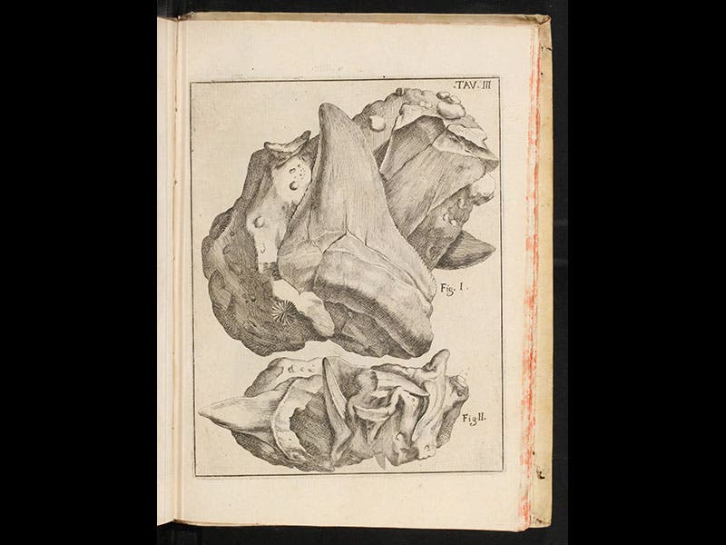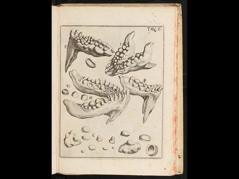 Agostino Scilla, a Sicilian painter and naturalist, was born Aug. 10, 1629. Scilla was an excellent artist, studying under Andrea Sacchi in Rome before returning to his native Messina. But Scilla grew interested in fossils—figured stones as they were called at the time—and especially in the "tonguestones of Malta", those curious specimens from the Mediterranean island that resembled large teeth or, to some, serpents' tongues (second image). In 1670, Scilla published a treatise arguing that fossils are the remains of formerly living organisms, and not "jokes of nature" that grew in the rocks where they were found. In particular, he maintained that tongue-stones are fossilized sharks’ teeth. He was not the first to make this argument—Nicholas Steno had done so in 1667, and so had Robert Hooke in 1668 (although his work was unpublished). What distinguished Scilla was the priority he gave to sense evidence in recognizing the true origin of fossils, and to an important spin-off of sense evidence—pictures. There are 30 engravings in his book, beautifully drawn by Scilla himself, which he uses as an important part of his argument (Steno had included only two engravings in his publication, and both had been borrowed from an unpublished manuscript that had been lying around Rome for almost a century).