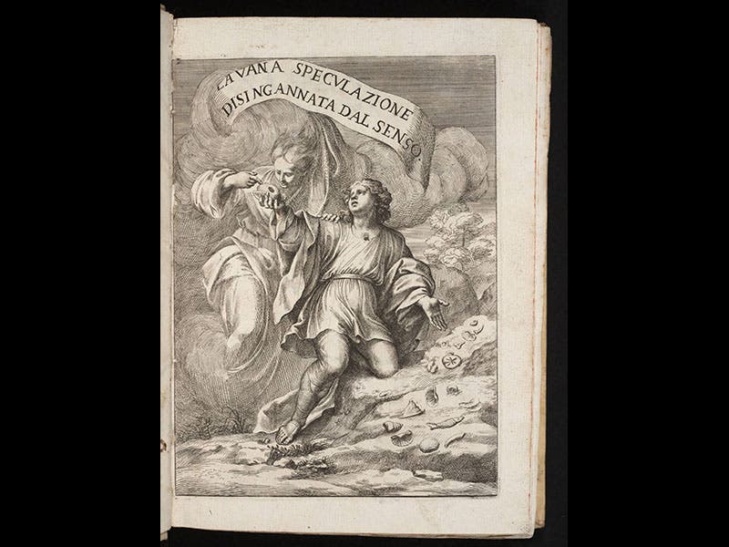 Even the title of Scilla's book was chosen to make a point about evidence; he called his treatise La vana speculazione disingannata dal senso (Vain Speculation Undeceived by Sense). On the allegorical frontispiece of the book (first image), which Scilla also designed, a personification of Sense is presenting a fossil shark’s tooth and sea urchin to a wispy academic philosopher, seemingly asking: “Why do you believe your books, and not your eyes?” We have several of editions of Scilla's treatise, including the first of 1670, in the History of Science Collection.