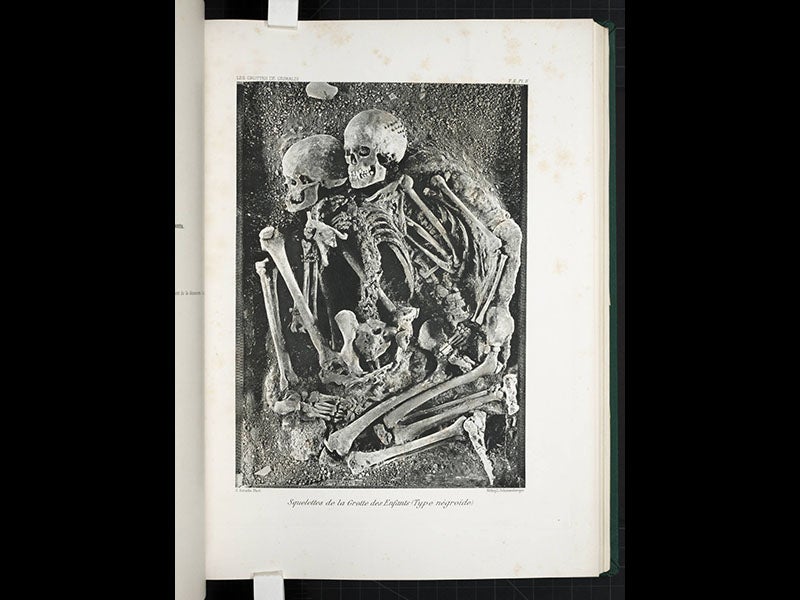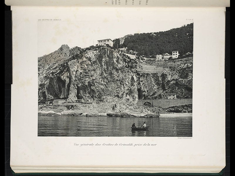 Albert Grimaldi, who became Albert I, the 10th Prince of Monaco, was born Nov. 13, 1848 (see first image above). Albert was a great patron of the sciences, especially anthropology; he founded the Museum of Prehistoric Anthropology of Monaco and the Institute of Human Paleontology in Paris. During his reign (1889-1922), a number of caves were discovered along the coast near Menton, just east of Monaco; they contained prehistoric remains and artifacts, and they were promptly named the Grimaldi Caves, after the Prince (for a map, see second image; for a view of several of the grottos, see third image). A pair of human skeletons was unearthed in one of the caves, called Baousse-Rousse, the “Red Cliffs”. In the tradition of giving catchy names to important specimens (Neanderthal man, Java man), the skeletons from Baousse-Rousse were called "Grimaldi man.” Grimaldi man, however, became quite controversial; the discoverers thought they saw certain negroid features in the specimens, and they were reconstructed with protruding jaws that, it turns out, the evidence does not really justify. Also, the two skeletons consist of an adolescent man and an older woman; when found, the young man was face up and the woman face down, but they were reconstructed in a "spoons" position, as if they had been buried like that (fourth image). The side view also allowed the jutting jaws to be visible. And that is the way they are displayed to this very day in the Monaco Museum, with a disclaimer about the mistakes in reconstruction (fifth image). The disclaimer, however, is not very apologetic. And the erroneous display remains uncorrected.