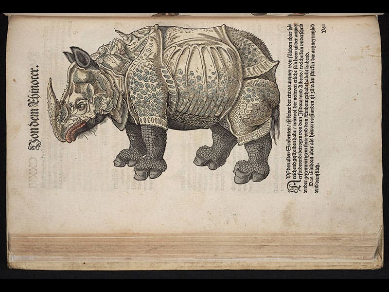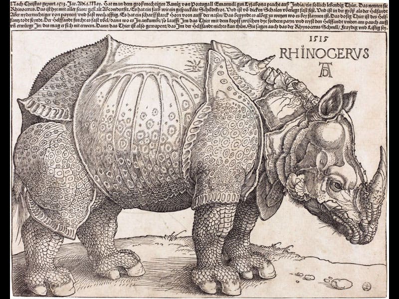 Albrecht Dürer, a German artist and engraver, died Apr. 6, 1528, at age 56.   Dürer was one of the most accomplished artists of the Northern Renaissance, and he is known for his fine engravings of Saint Jerome; Knight, Death, and the Devil; and Desiderius Erasmus. Today we feature his most influential natural history print, his Rhinoceros woodcut of 1515. An Indian rhinoceros had been gifted to the King of Portugal by Goa in India. Upon its arrival in Lisbon, sketches were made, and one of these found its way to Nuremberg, where it was seen by Dürer and turned into a more finished drawing (first image), and then into a memorable woodcut (second image). This rhino, wearing what seems to be a coat of armor, became the standard for all images of the beast until another one reached Europe in the 18th century.