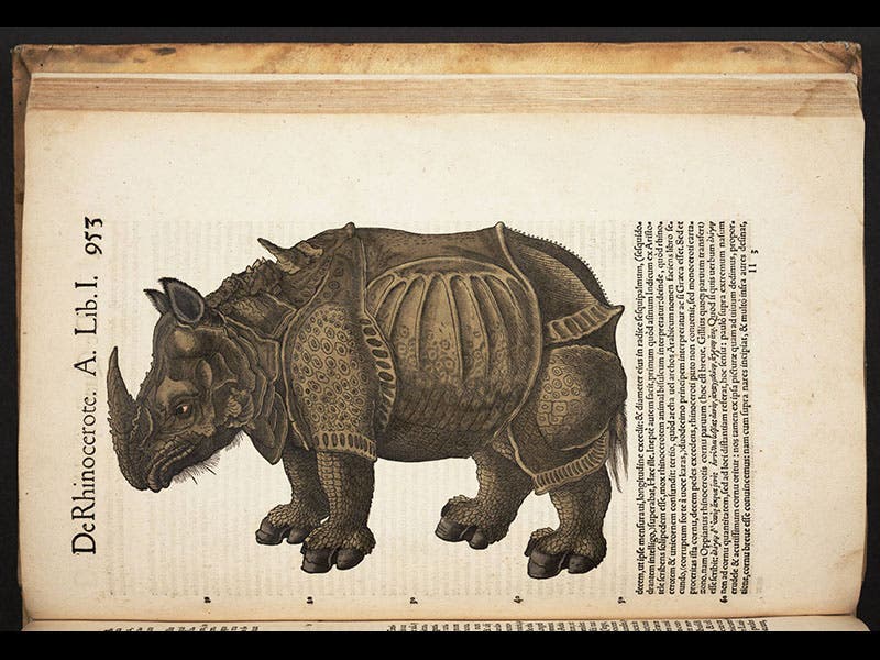 We have four of these copies, all woodcuts, in our History of Science Collection: in the Latin edition of Conrad Gesner's History of Animals (1551; third image) and in the German edition of 1563 (fourth image); in Sebastian Münster’s' Cosmography (1572; fifth image); and in Ulisse Aldrovandi's History of Cloven-hoofed Quadrupeds (1621; sixth image). Munster's Cosmography (first edition, 1544) was reprinted so often that the woodblock cracked. The crack has grown quite visible in our edition; later on, the block split completely in two and was glued back together again, but slightly out of alignment, so that the crack disappeared, but the animal was now slightly out of sorts.
