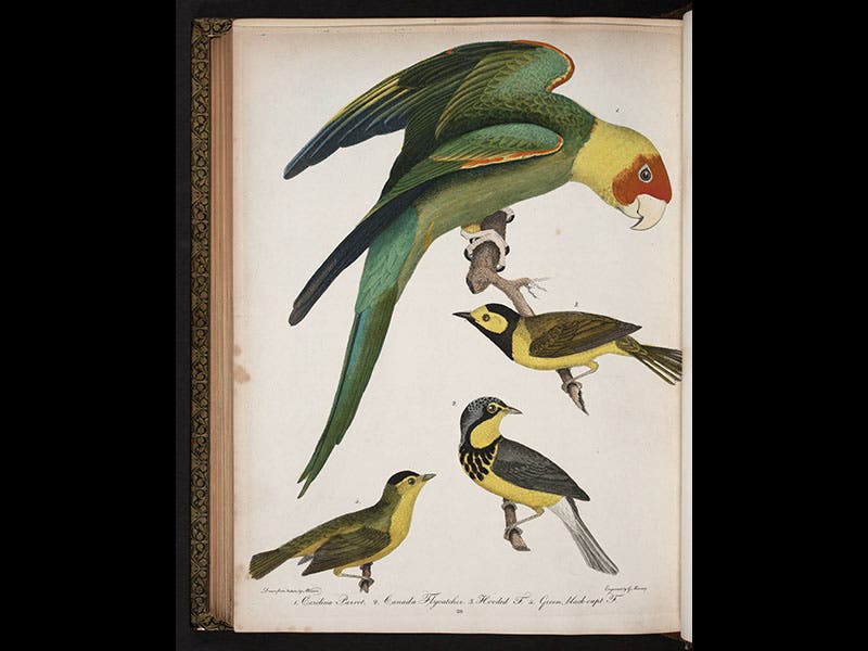 The first five images above are all taken from the American Ornithology and depict, among others, the great heron (first image), a black skimmer (second image), the now-extinct Carolina parakeet (third image), a painted bunting (fourth image), and two birds named after William Clark and Meriwether Lewis (fifth image). The last image shows a statue of Wilson, erected outside of Paisley Abbey in his native Scotland.