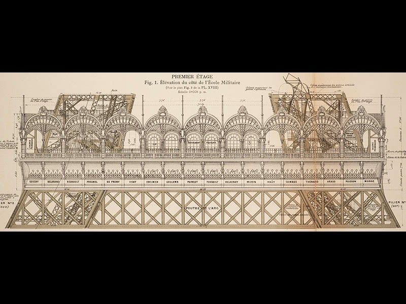It is not often realized, even by visitors, that Eiffel chose to honor 72 eminent French scientists and engineers and had their names engraved on a narrow frieze that runs around the tower, just below the first stage. The names were accidently painted over and forgotten in the early 20th century, but in 1986 they were re-discovered and restored to readability. In one of his diagrams of the structure of the tower, Eiffel shows us one side, with 18 of the names drawn in (see sixth image above).