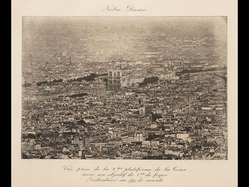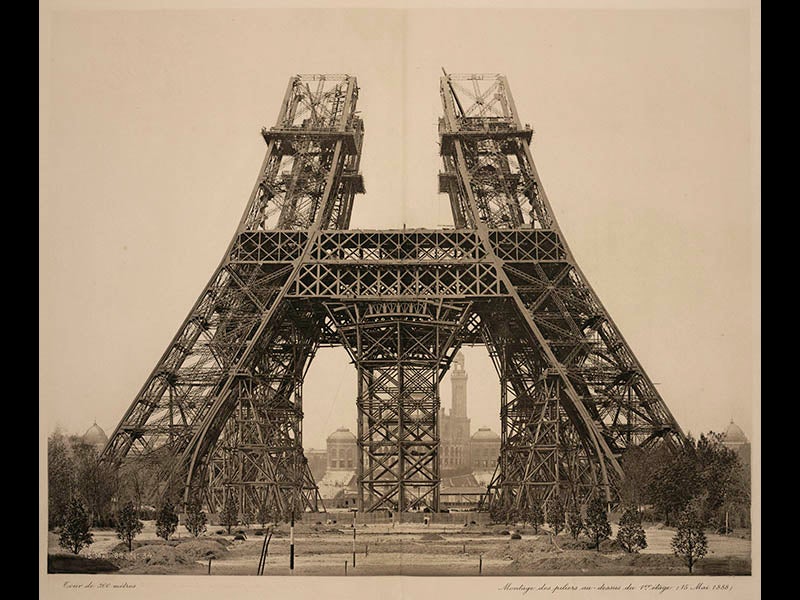 Alexandre Gustave Eiffel, a French structural engineer, was born Dec. 15, 1832. In 1886, to highlight the upcoming world’s fair in Paris in 1889, Eiffel proposed building a 300 meter iron tower on the Champs Mars to overlook the exposition grounds. Work on the tower started in 1887, and by March of 1889, the structure was completed. Some years later, Eiffel published a large two-volume folio documenting the construction process, and the second volume contains diagrams of every detail of the tower (and of the elevators that ran up two of the legs), as well as photographs of the tower as it rose from the ground. The first three images above are taken from that volume, and show stages of the construction. Image four shows a view of the cathedral of Notre Dame, as seen from the top of the completed tower. The fifth image, a contemporary postcard, shows us how the Eiffel Tower fit into the exposition grounds.