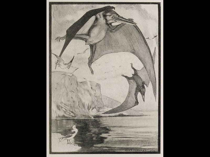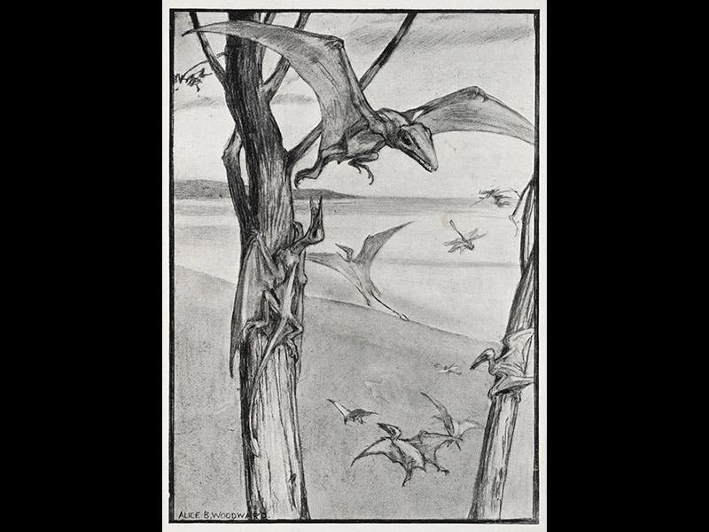 In 1912, Knipe issued a second book, Evolution in the Past, and this time 50 of the 56 plates were provided by Miss Woodward. We see above several Iguanodon (third image) and a cluster of various pterosaurs (fourth image). We displayed another Woodward drawing of an Iguanodon, taken from a different work, in our exhibition Paper Dinosaurs.