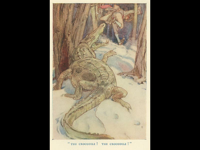 Alice also illustrated an edition of Peter Pan. One wonders if her experience drawing prehistoric reptiles was useful when it came to drawing Captain Hook’s nemesis, the crocodile (fifth image).
