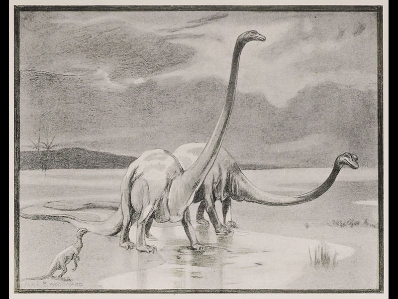Alice B. Woodward, an English artist, was born Oct. 3, 1862. Woodward was a very popular book illustrator in the early 20th century, providing the images for later editions of Alice in Wonderland, Black Beauty, and children’s versions of several Gilbert and Sullivan operettas. Alice also did restorations of dinosaurs and other extinct animals, perhaps because her father, Henry Woodward, was Keeper of Geology at what is now the Natural History Museum, and did restorations himself, only he put together real fossilized bones. Alice preferred to restore them on paper. Henry Knipe’s Nebula to Man (1905), which illustrates the entire history of life on earth, has 13 plates by Alice, including depictions of a pair of Diplodocus (first image) and a flight of Pteranodon (second image).