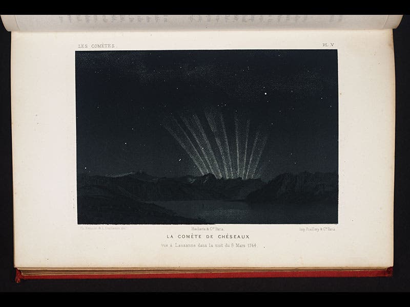Amédée Guillemin, a French science writer, was born July 5, 1826. Guillemin wrote a number of books on astronomy intended for the general public, such as Le ciel (1866), La lune (1868), and Le soleil (1873). The books were so popular in France that British publishers took notice, and nearly all of Guillemin's books appeared almost immediately in English translation. Above we reproduce images from Les cometes (1875) and its English version, The World of Comets (1877), and one can see at once why Guillemin's books were so appealing, with their wood engravings and handsome colored lithographs. The first three images are from the French edition and depict, in order, Donati's comet over Paris in 1858; the Great comet of 1843; and Cheseaux's comet of 1744. The next three images shows the cover of the English edition, with Donati's comet stamped in gold on the blue cloth; Cheseaux’s comet again, in its English version; and a beautiful mezzotint that does not appear in the French edition, depicting the Great comet of 1861.