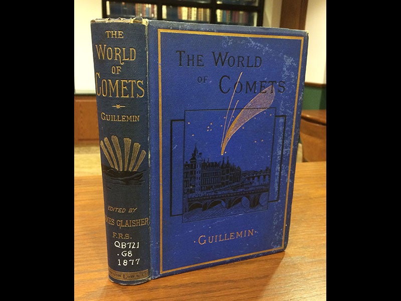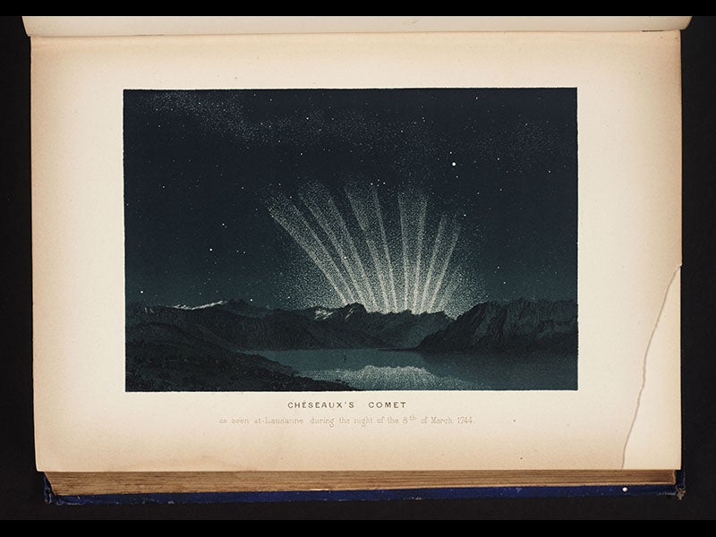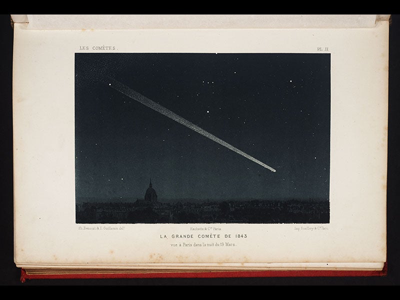 Amédée Guillemin, a French science writer, was born July 5, 1826. Guillemin wrote a number of books on astronomy intended for the general public, such as Le ciel (1866), La lune (1868), and Le soleil (1873). The books were so popular in France that British publishers took notice, and nearly all of Guillemin's books appeared almost immediately in English translation. Above we reproduce images from Les cometes (1875) and its English version, The World of Comets (1877), and one can see at once why Guillemin's books were so appealing, with their wood engravings and handsome colored lithographs. The first three images are from the French edition and depict, in order, Donati's comet over Paris in 1858; the Great comet of 1843; and Cheseaux's comet of 1744. The next three images shows the cover of the English edition, with Donati's comet stamped in gold on the blue cloth; Cheseaux’s comet again, in its English version; and a beautiful mezzotint that does not appear in the French edition, depicting the Great comet of 1861.