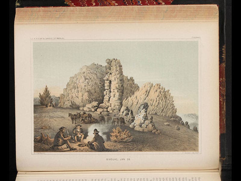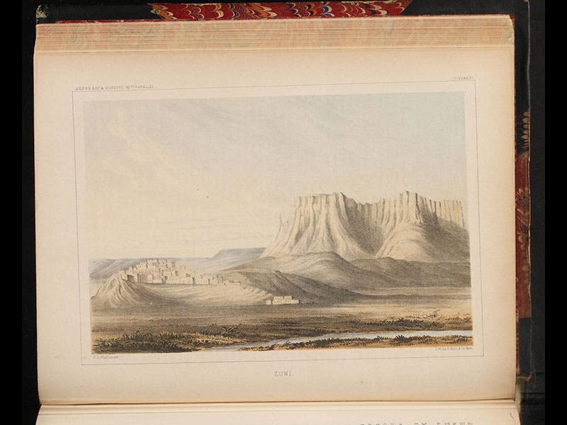 The official narrative of the Whipple expedition was published as volume 3 of the Pacific Railroad Reports, which in its 13 volumes encompassed all four of the parallel surveys plus three California surveys. Whipple's narrative differed from some of the others in that he was very interested in ethnography and was fascinated by native American culture, so Whipple’s volume has a number of chromolithographs of pueblos (see second image above), native peoples (fourth image) and Indian artifacts (fifth image). Other lithographs give a good account of the landscape they passed through, so you can see a bivouac (first image), the San Francisco mountains in Arizona (third image), and a stratified hill that Whipple called Pyramid Mountain (sixth image)