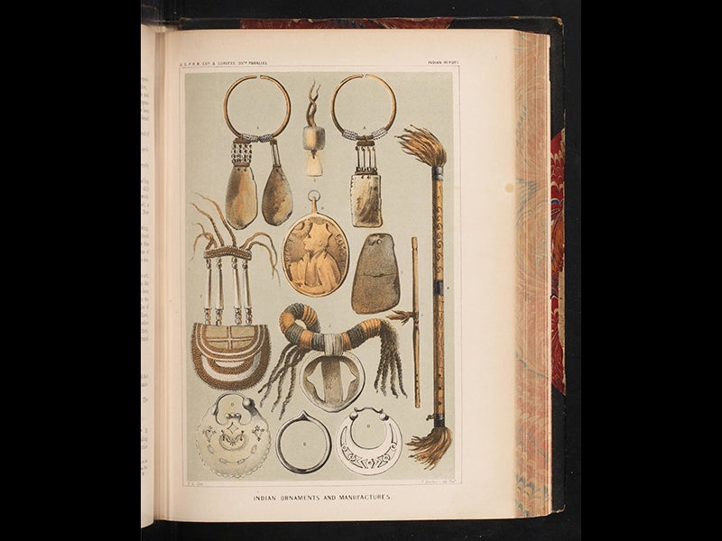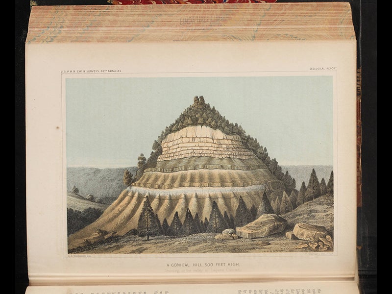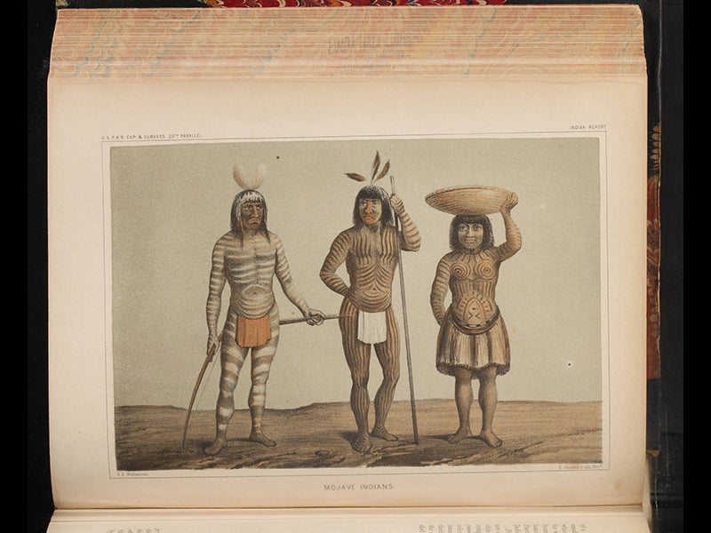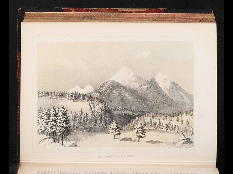 The official narrative of the Whipple expedition was published as volume 3 of the Pacific Railroad Reports, which in its 13 volumes encompassed all four of the parallel surveys plus three California surveys. Whipple's narrative differed from some of the others in that he was very interested in ethnography and was fascinated by native American culture, so Whipple’s volume has a number of chromolithographs of pueblos (see second image above), native peoples (fourth image) and Indian artifacts (fifth image). Other lithographs give a good account of the landscape they passed through, so you can see a bivouac (first image), the San Francisco mountains in Arizona (third image), and a stratified hill that Whipple called Pyramid Mountain (sixth image)