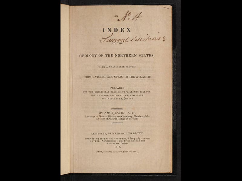 Amos Eaton, an American geologist, was born May 17, 1776. Eaton was a co-founder (with Stephen van Rensselaer) of Rensselaer Polytechnic Institute in Troy, New York, and he taught there until his death in 1842. In 1818, Eaton published An Index to the Geology of the Northern States (third image), which contains a large folding geological section, showing the rock formations from Boston to the Hudson River (first image). It is, we believe, the first geological section of any part of North America. One of the prominent features of this woodcut is the word "Granite" spelled out in large letters at the bottom, indicating the bedrock below most of New England (second image).