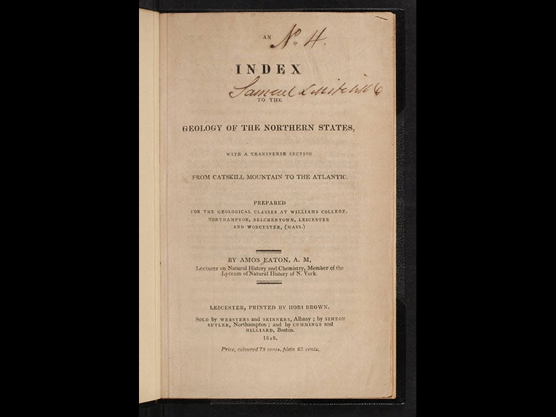 Amos Eaton, an American geologist, was born May 17, 1776. Eaton was a co-founder (with Stephen van Rensselaer) of Rensselaer Polytechnic Institute in Troy, New York, and he taught there until his death in 1842. In 1818, Eaton published An Index to the Geology of the Northern States (third image), which contains a large folding geological section, showing the rock formations from Boston to the Hudson River (first image). It is, we believe, the first geological section of any part of North America. One of the prominent features of this woodcut is the word "Granite" spelled out in large letters at the bottom, indicating the bedrock below most of New England (second image).