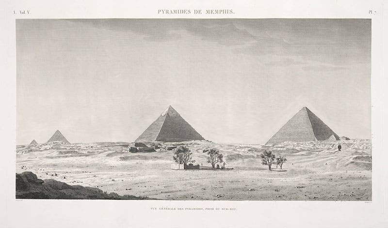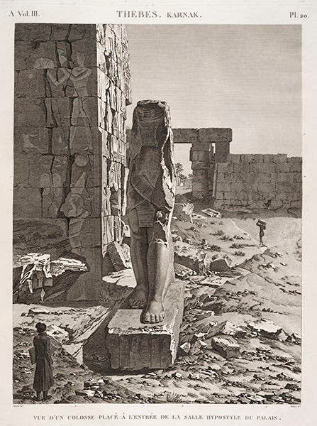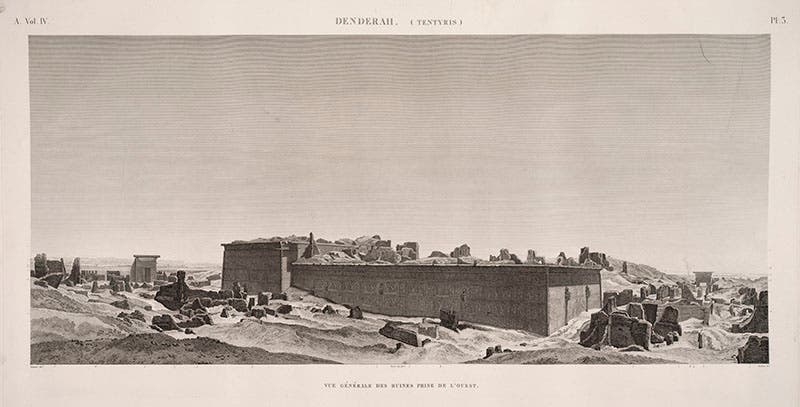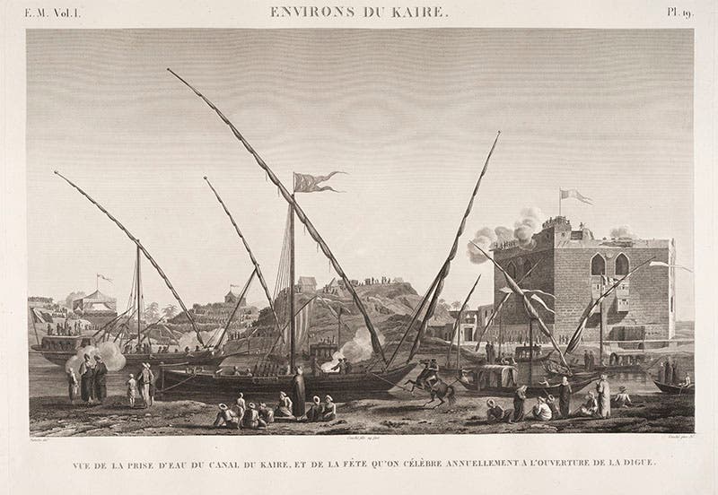 André Dutertre, a French artist, was born June 9, 1753.  Dutertre accompanied Napoleon Bonaparte on his invasion of Egypt in 1798. He was supposed to be sketching irrigation machinery, glass-making factories, and canal boats (which he did, to some extent, see fifth image), but when he and the scientific corps discovered the antiquities of Egypt, there was no holding them back.  Many of the engravings in the Description de l’Egypte (1809-28) were based on Dutertre drawings, such as the plates depicting the pyramids at Giza (first image), the sand-filled interior of the temple at Karnak (second image), the temple at Dendera, where the stone zodiac was found (third image), and a ruined colossus at Karnak (fourth image)--note the artist contemplating the statue, perhaps Dutertre placing himself within the scene.