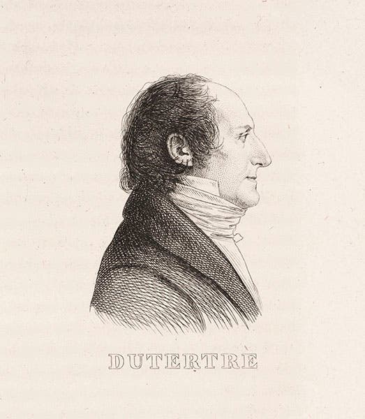 Dutertre distinguished himself from the other expedition artists by taking on the task of making pencil sketches of every scientist and engineer who accompanied Napoleon to Egypt.  One of the webpages of our exhibition, Napoleon and the Scientific Expedition to Egypt (2006) [link to: http://napoleon.lindahall.org/gallery.shtml ] presents an engraving of the first meeting of the Institute of Egypt, and we invite the viewer to compare the figures depicted in the scene with portrait sketches of the expedition members arranged below.  All but one of those sketches were drawn by Dutertre; they were later printed in Marie Reybaud's ten-volume Histoire de l'expedition francaise en Egypte (1830-36), which we also have in our collection. The self-portrait of Dutertre (sixth image) is from this work.