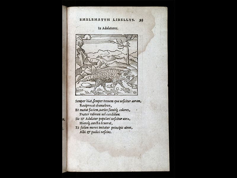 Alciato's emblematic invention proved incredibly popular.  By 1551, his Emblemata had gone through 14 editions, and before long other emblem writers took up the challenge, so that by the end of the century, there were literally hundreds of emblem books in print, containing tens of thousands of emblems.  The natural history emblems evolved over time, as better images became available of some of the exotic animals; the chameleon emblem of 1591 (third image) is a considerable improvement over the 1534 version.