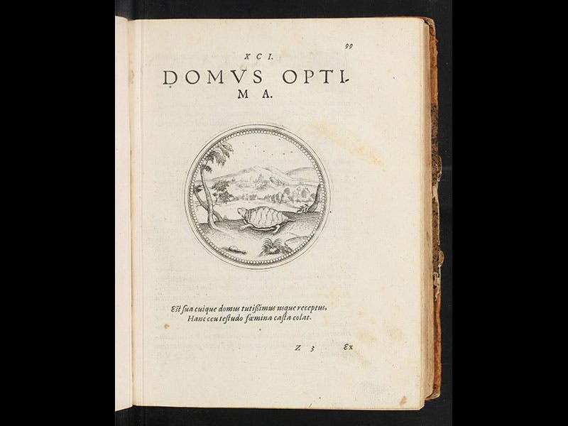 Natural history writers, such as Conrad Gessner, took a great interest in emblem literature, and in his Historia animalium (1551-58), Gessner cited Alciato frequently.  This interest fed back into the emblem-writing community, so that by 1590, Joachim Camerarius began issuing an entire 4-volume emblem work that contained nothing but natural history emblems--400 of them in all.  We will try to remember to feature Camerarius in this space on his birthday next Nov. 6, since we own a copy of his Symbolorum & Emblematum ex Animalibus (1605), the only emblem book in our collection.  We show one of his emblems above, a tortoise, with the motto “domus optima”—“the best house” (fourth image).   Ulisse Aldrovandi, in turn, cited every single relevant Camerarius emblem in his 13-volume natural history which began publication in 1599.  Gesner's and Aldrovandi's great interest in emblematic and adagial lore has led to this period being identified as the age of "emblematic natural history."