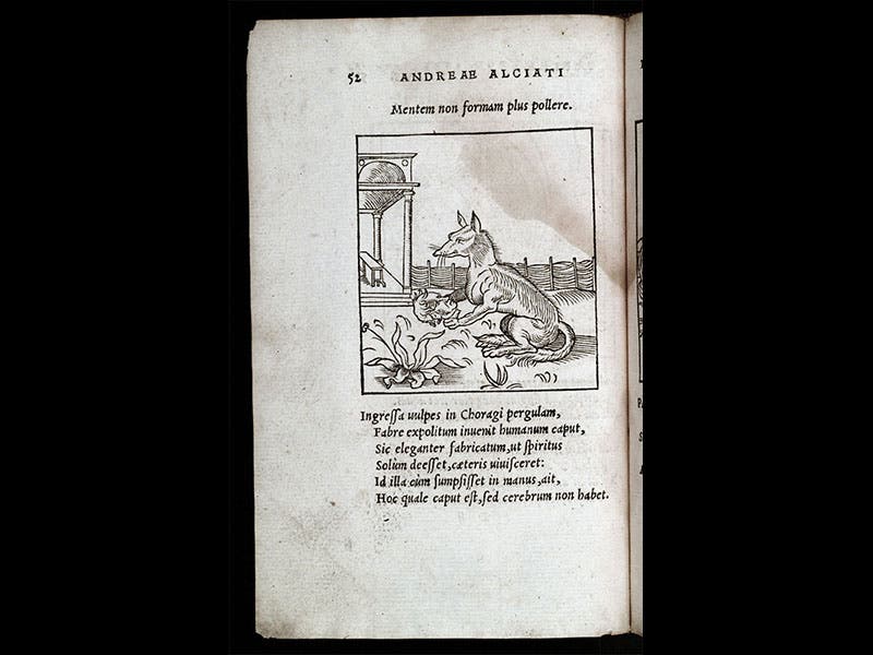 Andrea Alciato, an Italian lawyer, was born May 8, 1492.  Often referred to as Alciati in earlier literature, Alciato created a whole new literary genre in 1531 by inventing the emblem and publishing the first emblem book.  An emblem, as Alciato conceived of it, consisted of three elements: an image, a pithy motto, and a short explanatory verse.  In the first example above, we see a woodcut of what is identified as a chameleon, beneath a motto, "in adulatores"--"flatterers"--and a text that explains that a chameleon represents a flattering sycophant, because it changes its color to suit its surroundings.  Another Alciato emblem (second image) depicts a fox looking at a theatrical mask, with the motto: "mentem non formam plus pollere"--"a mind is better than a pretty face."  Only a few of Alciato's emblems depict natural objects like animals and plants, but we focus on them here, because we are interested in Alciato's impact on natural history.