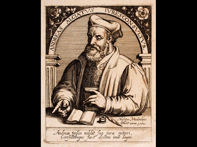 There are a number of woodcuts of Alciato that appeared in portrait books of the later sixteenth century; we see one of those above (fifth image).  All of Alciato’s emblems from every edition of his Emblemata are available on the splendid Alciato at Glasgow website, from which we drew our  Alciato emblem images.