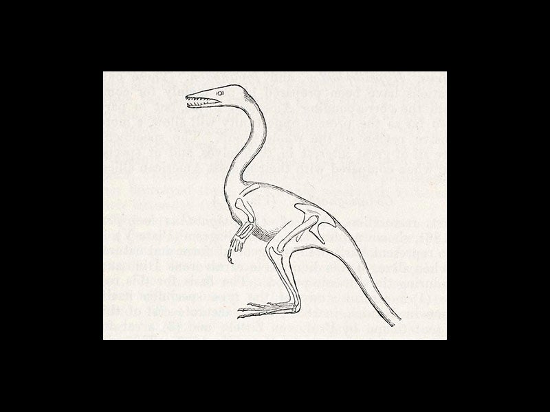 Wagner did not notice the presence of a small reptile skeleton within the ribs of Compsognathus (fourth image). Forty years later, Baron Nopcsa decided that these were the bones of a tiny lizard, remnants of Compsognathus’ last meal, a paper that we did not exhibit for Paper Dinosaurs, but which we added to the online version of that exhibition.