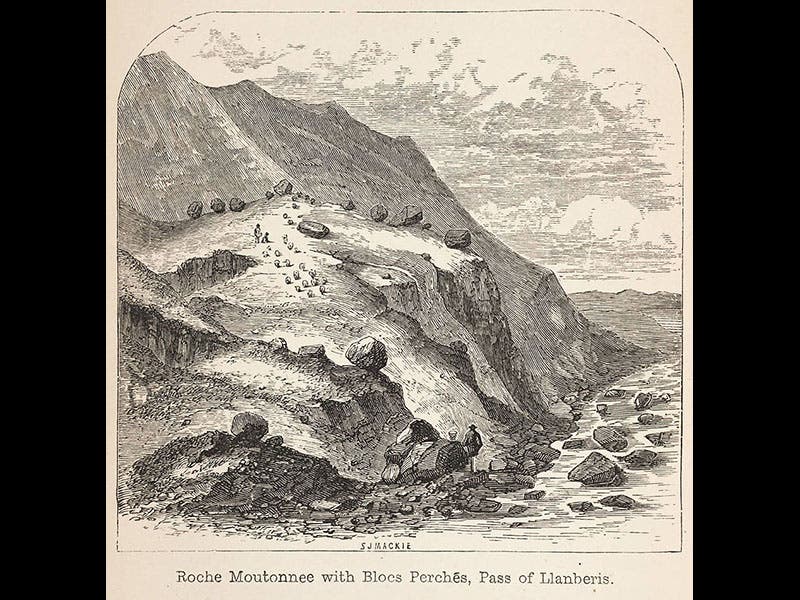Andrew Crombie Ramsay, a Scottish geologist, was born Jan. 31, 1814. In the 1840s, Ramsay went to work for the relatively new Geological Survey of Great Britain and was assigned to explore and map Wales. Many Welsh terrains bear the heavy marks of glaciation, exhibiting moraines, erratic blocks, striated rock surfaces, and general glacial debris. However, the idea of an ice age was relatively new, having only been proposed in 1840 by Louis Agassiz, with his evidence mostly coming from Switzerland. Ramsay at first held to the conventional opinion that erratic blocks were transferred by floating icebergs, and moraines were the products of heavy floods. But by the 1850s, he converted to the glacial theory, and in 1860 he published a book, The Old Glaciers of Switzerland and North Wales, in which he made the case for an Ice Age in Great Britain. The book has illustrations of local glacier-scoured boulders known as roches moutonées (first image) as well as perched rocks left behind when glaciers melted (second image).