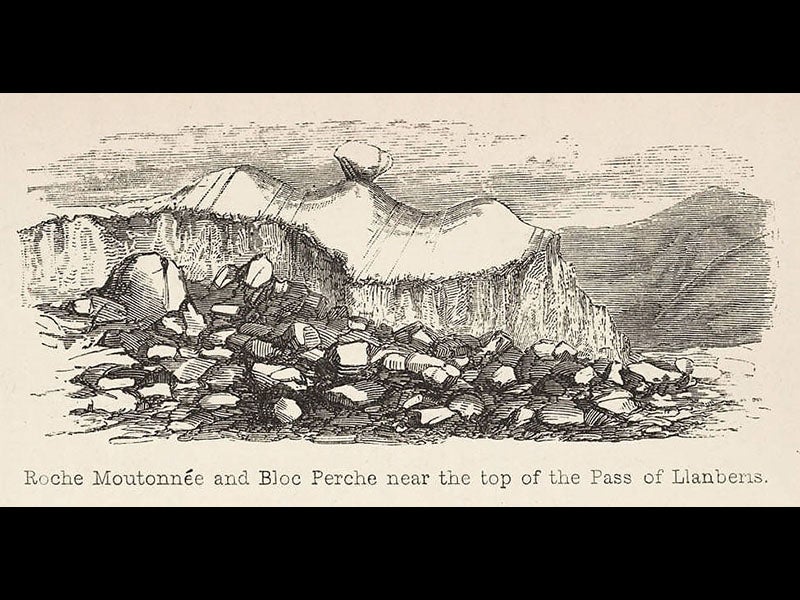 Andrew Crombie Ramsay, a Scottish geologist, was born Jan. 31, 1814. In the 1840s, Ramsay went to work for the relatively new Geological Survey of Great Britain and was assigned to explore and map Wales. Many Welsh terrains bear the heavy marks of glaciation, exhibiting moraines, erratic blocks, striated rock surfaces, and general glacial debris. However, the idea of an ice age was relatively new, having only been proposed in 1840 by Louis Agassiz, with his evidence mostly coming from Switzerland. Ramsay at first held to the conventional opinion that erratic blocks were transferred by floating icebergs, and moraines were the products of heavy floods. But by the 1850s, he converted to the glacial theory, and in 1860 he published a book, The Old Glaciers of Switzerland and North Wales, in which he made the case for an Ice Age in Great Britain. The book has illustrations of local glacier-scoured boulders known as roches moutonées (first image) as well as perched rocks left behind when glaciers melted (second image).