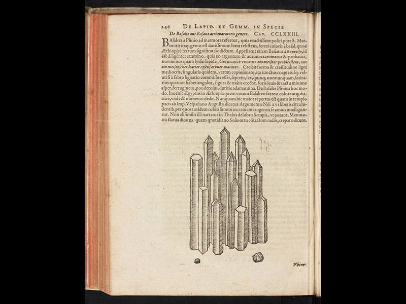 Anselmus Boetius de Boodt, a Flemish physician and naturalist, died June 21, 1632, at the age of perhaps 80. De Boodt was not only the personal physician of the Holy Roman Emperor Rudolf II, he was also the principal curator of Rudolf’s Kunstkammer in Prague, which was one of the great cabinets of curiosities in all of Europe. De Boodt's special interest was minerals, and in 1609, he published one of the first mineralogical treatises of the late Renaissance, Gemmarum et lapidum historia (History of Gems and Stones). At the time, fossils were considered to be stones, figured stones, and so many of the woodcuts in Boodt's book illustrate fossils, such as glossopetrae or tonguestones (first image), and cerauniae or thunderstones (which we now recognize as prehistoric human tools; second image), as well as a hefty chunk of columnar basalt (third image).