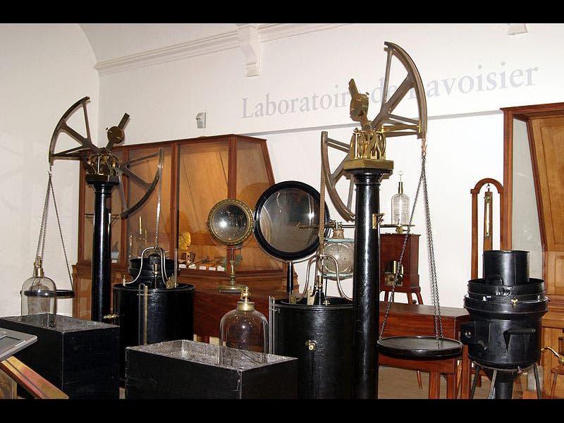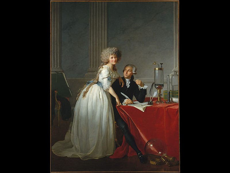 The oxygen theory of combustion turned out to have much more explanatory power that the phlogiston theory, especially since it explained why substances gain weight when they oxidize. Lavoisier later set down the first modern list of elements (second image), and he also reformed chemical nomenclature, dumping the colorful alchemical language of “flowers of sulfur” and “sugar of lead” in favor of carbonates and oxides and adjectives like sulfuric and nitrous. His collaborator in much of his work was his wife, Marie-Anne Pierrette Paulze, who also illustrated many of Lavoisier’s scientific publications. It is sad that she had to witness Lavoisier’s final fate. Lavoisier was a member of the Ferme-Générale, a tax collection agency, and he was arrested along with the other administrators during the Reign of Terror and executed by guillotine on May 8, 1794, at age 50. As a countryman said at the time, “It took only a moment to cause this head to fall, and a hundred years will not suffice to produce its like.”