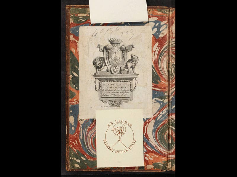 The first image above shows a reconstruction of Lavoisier’s laboratory at the Musée des arts et métiers in Paris. The third image is a double portrait of Antoine and Marie-Anne, painted by the great Jacques-Louis David in 1788; you can see it in the Metropolitan Museum of Art in New York City. We have nearly all of the works of Lavoisier in our collections, as well as numerous translations. An additional book in our Library, Rudolf Raspe’s Specimen historiæ naturalis globi terraquei (1763) has a bookplate indicating it came from Lavoisier’s Library; it also sports the subsequent ownership label of the great 20th-century physician and bibliophile, Herbert McLean Evans (fourth image).