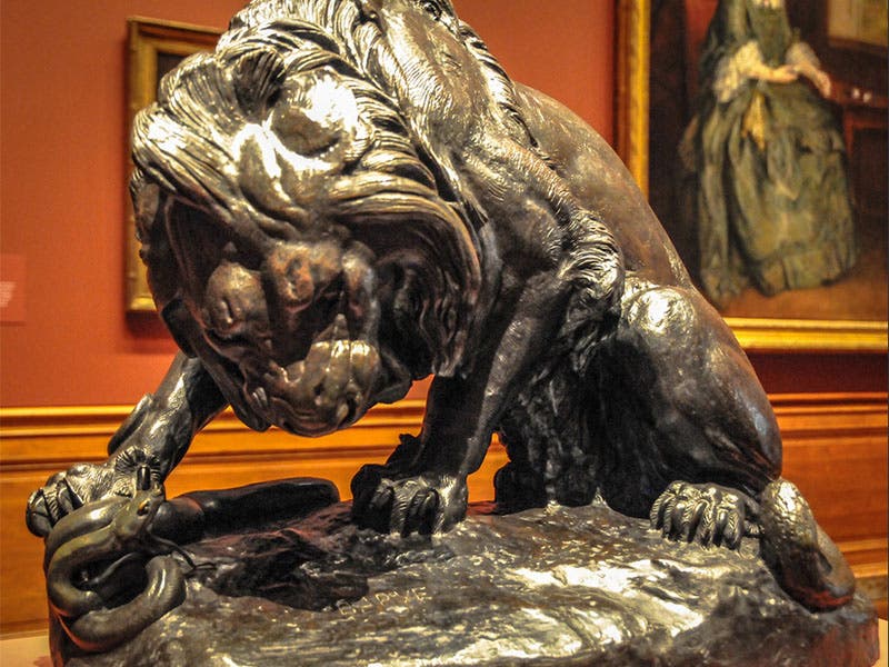 Antoine-Louis Barye, a French sculptor, was born Sep. 24, 1796. Barye was the first and foremost sculptor of the Animalier school of 19th-century Paris. Barye made large bronzes of mostly ferocious animals in a very life-like style, and he executed nearly all of the casts himself, so they are meticulous in detail and finish. He found most of his subjects in the menagerie of the Jardin des Plantes. One of his most famous pieces, Lion and Serpent, was exhibited in 1832 and is now in the Tuilleries; there is a copy in Baltimore at the Walters Art Gallery (see first image above). Another well-known piece, Tiger Devouring a Gavial, was exhibited at the Paris Salon in 1831 and is now in the Louvre; a reduced copy is also in the Walters Gallery (second image). Jaguar Devouring a Hare, ca. 1850, is a lovely bronze (third image); the Nelson-Atkins Museum here in Kansas City has the model for this piece, although it is not currently on display. And Barye’s Crouching Dog has always been a popular piece, available in much reduced versions on the bronze collectibles market (fourth image)