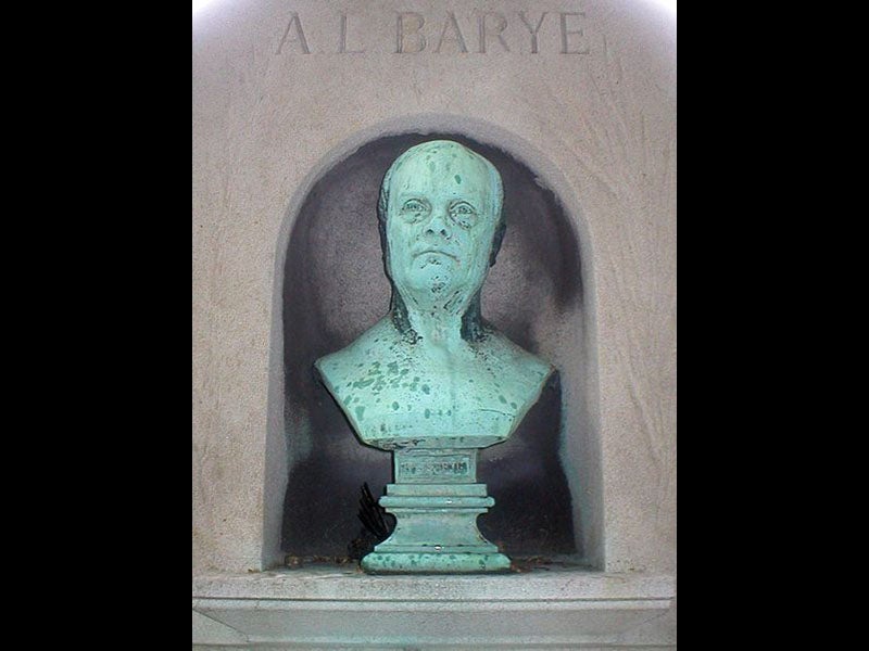 Barye was buried in the Père Lachaise cemetery in Paris, where a memorial portrait bust sits above his grave (fifth image).