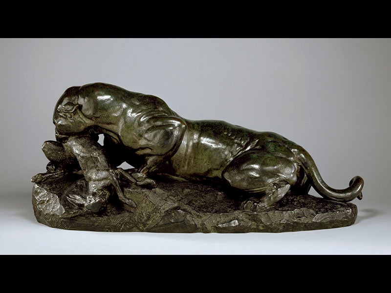 Antoine-Louis Barye, a French sculptor, was born Sep. 24, 1796. Barye was the first and foremost sculptor of the Animalier school of 19th-century Paris. Barye made large bronzes of mostly ferocious animals in a very life-like style, and he executed nearly all of the casts himself, so they are meticulous in detail and finish. He found most of his subjects in the menagerie of the Jardin des Plantes. One of his most famous pieces, Lion and Serpent, was exhibited in 1832 and is now in the Tuilleries; there is a copy in Baltimore at the Walters Art Gallery (see first image above). Another well-known piece, Tiger Devouring a Gavial, was exhibited at the Paris Salon in 1831 and is now in the Louvre; a reduced copy is also in the Walters Gallery (second image). Jaguar Devouring a Hare, ca. 1850, is a lovely bronze (third image); the Nelson-Atkins Museum here in Kansas City has the model for this piece, although it is not currently on display. And Barye’s Crouching Dog has always been a popular piece, available in much reduced versions on the bronze collectibles market (fourth image)
