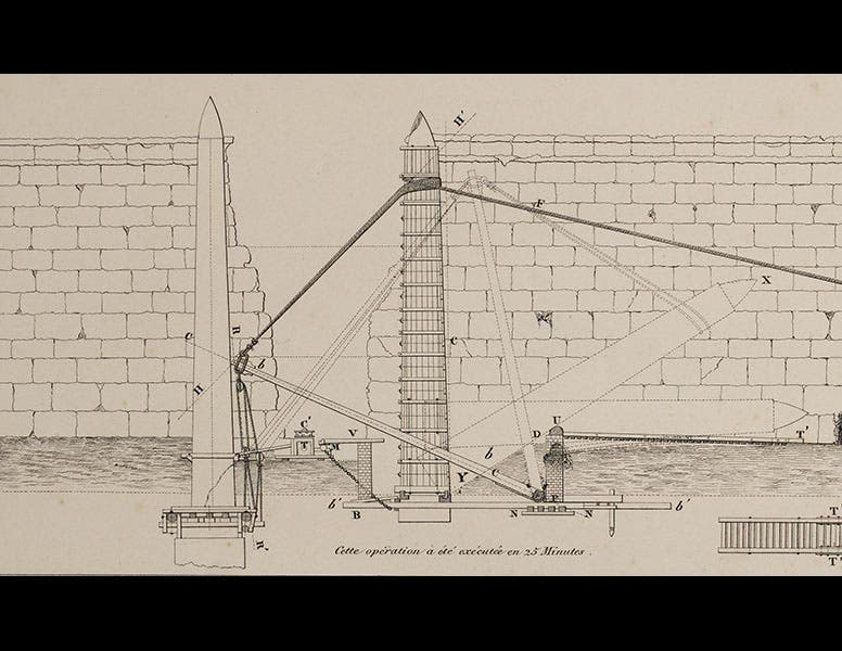 The mechanism Lebas used to lower the obelisk was cleverly designed and worked well.  A plate from his book shows the entire apparatus (third image), while a detail gives us a better view of the lowering mechanism (first image). The obelisk was then conveyed to the Nile and loaded aboard the Louqsor.  There is a model at the National Marine Museum in Paris that shows the loading operation (fourth image).