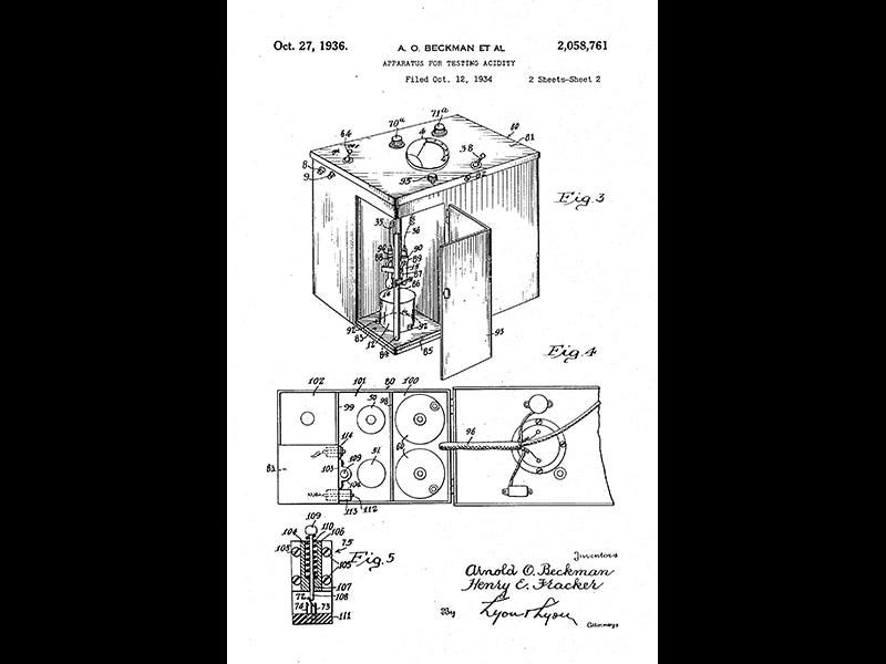 Beckman’s fascination with industrial applications for chemistry persisted after he earned his doctorate from the California Institute of Technology. When he learned that local citrus growers were having difficulty determining the acidity of lemon juice, for example, he responded by creating the first electronic pH meter (third image). Beckman’s invention provided precise, reliable measurements without the need for special training or expertise. It became extremely popular, and by the end of the 1930s, Beckman left academia to manufacture laboratory instruments full time.