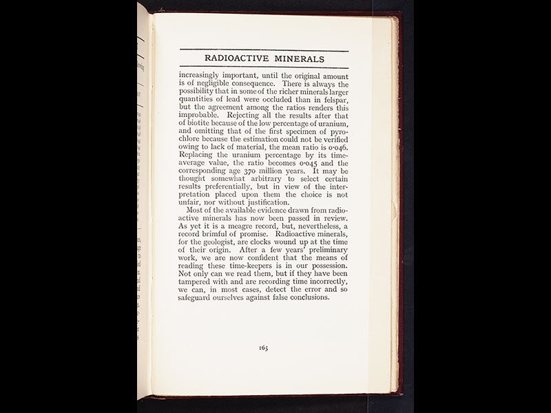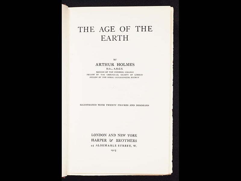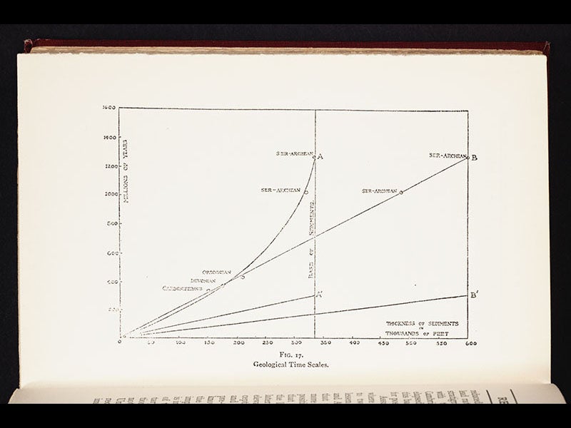 In 1913, Holmes published a little book, The Age of the Earth, in which he discussed his dating of the Norwegian rock and presented a graph of the age of rocks that projected that the earth was at least 1600 million years old, marking the beginning of the end for Kelvin’s 100 million year-old earth. The images above, except for the portrait, are all from our copy of this book, and include the page with the 370 million-year-old rock, and the graph.