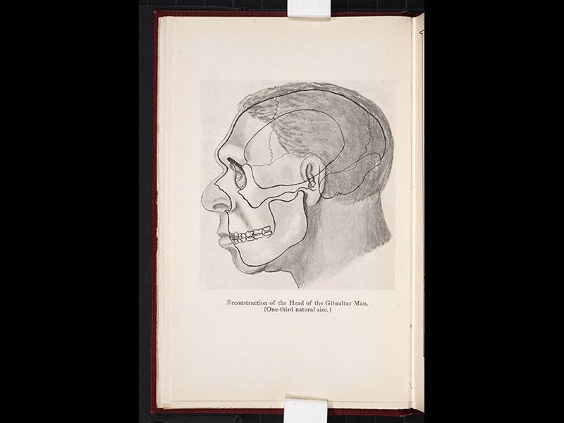 The cover of Keith’s The Antiquity of Man has a gold-stamped image of the Piltdown fragments decorating its blue cloth (second image above). The book also contains a reconstruction of Gibraltar man, a skull found in 1848 and finally recognized in the 1860s as a Neanderthal (third image above).