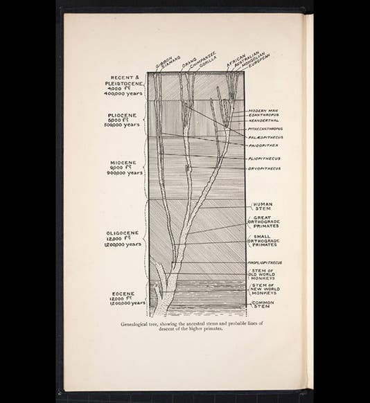 Arthur Keith, an English anthropologist, died Jan. 7, 1955, at age 88. Keith was one of the principal champions of Piltdown Man as an important pre-human ancestor, after its discovery in 1912. In 1915, Keith published a book, The Antiquity of Man, and the frontispiece to this work provides one of the first detailed human evolutionary trees (see first image above). All of the known human and primate fossils are included; you can see Neanderthal as an offshoot at upper right, and just below it, as another dead end, is Pithecanthropus, or Java man. Piltdown man, here called by its scientific name, Eoanthropus (dawn man) is the last off-branch before modern man. You will note that this tree leans to the right, or the "good side", as it goes upward, so that modern European man at the top is the farthest to the right, and thus visually presented as more advanced that modern Mongolian, Australian, or African humans. This bias in favor of European races, in evolutionary trees constructed by European anthropologists, is characteristic of much of 20th-century anthropology, and it has taken a lot of justifiable protest from non-European scholars to get such reconstructions straightened out and up and the biases removed. We displayed this plate in our 2012 exhibition, Blade and Bone: The Discovery of Human Antiquity.