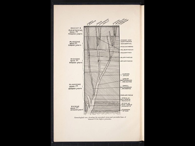 Arthur Keith, an English anthropologist, died Jan. 7, 1955, at age 88. Keith was one of the principal champions of Piltdown Man as an important pre-human ancestor, after its discovery in 1912. In 1915, Keith published a book, The Antiquity of Man, and the frontispiece to this work provides one of the first detailed human evolutionary trees (see first image above). All of the known human and primate fossils are included; you can see Neanderthal as an offshoot at upper right, and just below it, as another dead end, is Pithecanthropus, or Java man. Piltdown man, here called by its scientific name, Eoanthropus (dawn man) is the last off-branch before modern man. You will note that this tree leans to the right, or the "good side", as it goes upward, so that modern European man at the top is the farthest to the right, and thus visually presented as more advanced that modern Mongolian, Australian, or African humans. This bias in favor of European races, in evolutionary trees constructed by European anthropologists, is characteristic of much of 20th-century anthropology, and it has taken a lot of justifiable protest from non-European scholars to get such reconstructions straightened out and up and the biases removed. We displayed this plate in our 2012 exhibition, Blade and Bone: The Discovery of Human Antiquity.
