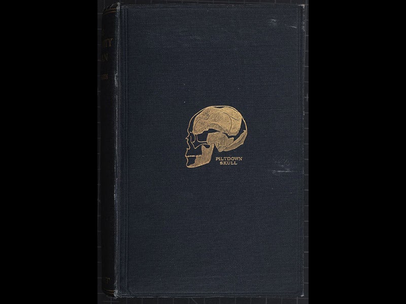 The cover of Keith’s The Antiquity of Man has a gold-stamped image of the Piltdown fragments decorating its blue cloth (second image above). The book also contains a reconstruction of Gibraltar man, a skull found in 1848 and finally recognized in the 1860s as a Neanderthal (third image above).