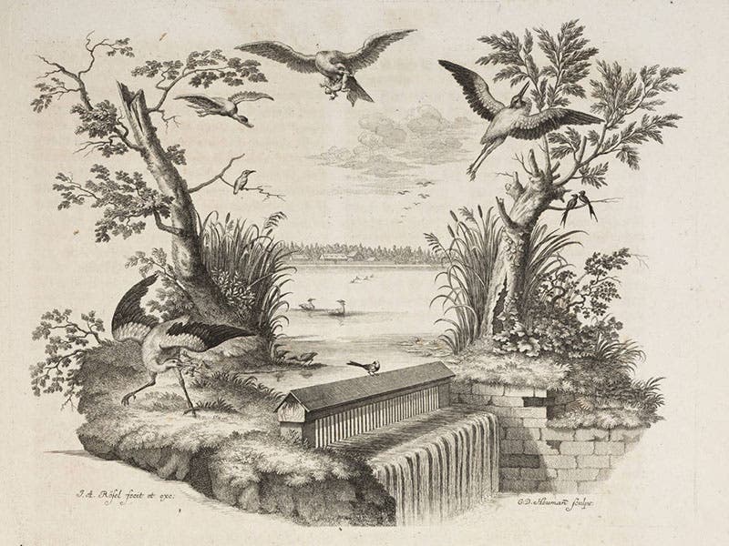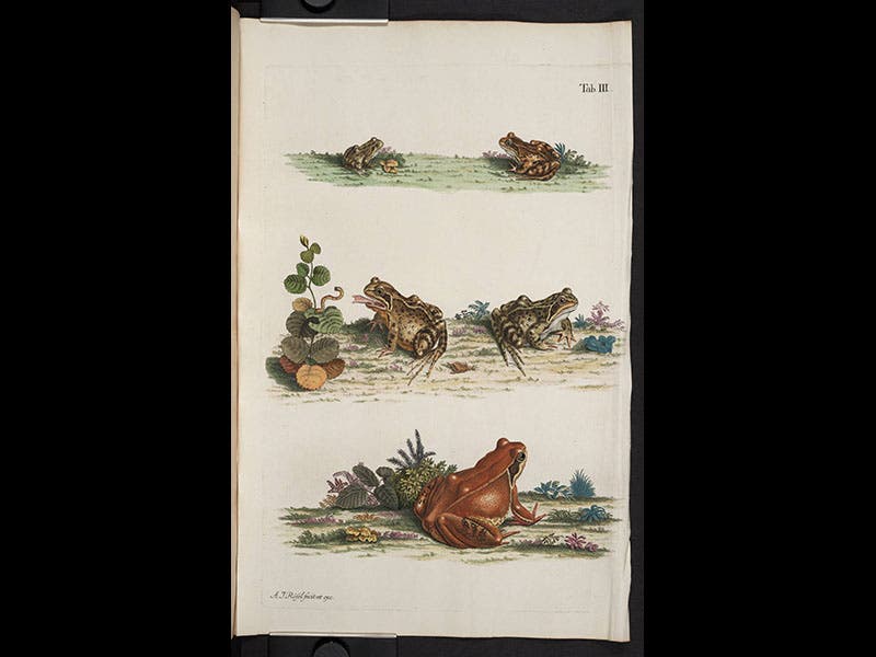 August Johann Rösel von Rosenhof, a German artist and naturalist, was born Mar. 30, 1705. Rösel was trained as a miniature painter, and apparently was quite a good one. While recuperating from an illness, he was introduced to a book by Maria Merian, Metamorphosis insectorum Surinamensium (1705), which contained beautiful colored engravings of insects. Rösel immediately turned his attention to drawing butterflies and caterpillars. After publishing a book on insects, he then moved on to amphibians, and in 1758 there appeared the most sumptuous book ever published on frogs, the Historia naturalis ranarum. It has twenty-four large plates, in pairs; one of each pair shows objects in outline, the other presents them in gorgeous color. Many of these are anatomical plates, but several show frogs in their natural habitats (see second image above, and a detail in the third image). If you thought frogs could never be beautiful, this book will disabuse you of that notion. The frontispiece is especially grand (first image above), and even the headpieces to the book’s major sections (fourth and fifth images above) were especially engraved for this book and show various bucolic frog-related scenes—bucolic for the observer, that is, since the frogs are being skewered or speared right and left. The final headpiece at least allows them to procreate their kind in peace (last image above).