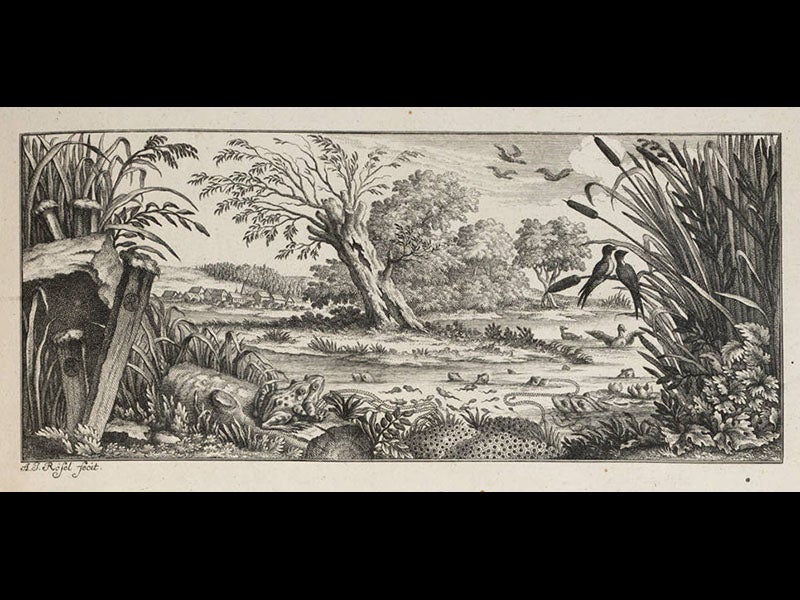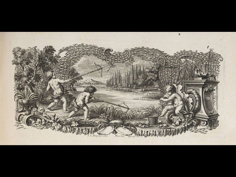 August Johann Rösel von Rosenhof, a German artist and naturalist, was born Mar. 30, 1705. Rösel was trained as a miniature painter, and apparently was quite a good one. While recuperating from an illness, he was introduced to a book by Maria Merian, Metamorphosis insectorum Surinamensium (1705), which contained beautiful colored engravings of insects. Rösel immediately turned his attention to drawing butterflies and caterpillars. After publishing a book on insects, he then moved on to amphibians, and in 1758 there appeared the most sumptuous book ever published on frogs, the Historia naturalis ranarum. It has twenty-four large plates, in pairs; one of each pair shows objects in outline, the other presents them in gorgeous color. Many of these are anatomical plates, but several show frogs in their natural habitats (see second image above, and a detail in the third image). If you thought frogs could never be beautiful, this book will disabuse you of that notion. The frontispiece is especially grand (first image above), and even the headpieces to the book’s major sections (fourth and fifth images above) were especially engraved for this book and show various bucolic frog-related scenes—bucolic for the observer, that is, since the frogs are being skewered or speared right and left. The final headpiece at least allows them to procreate their kind in peace (last image above).