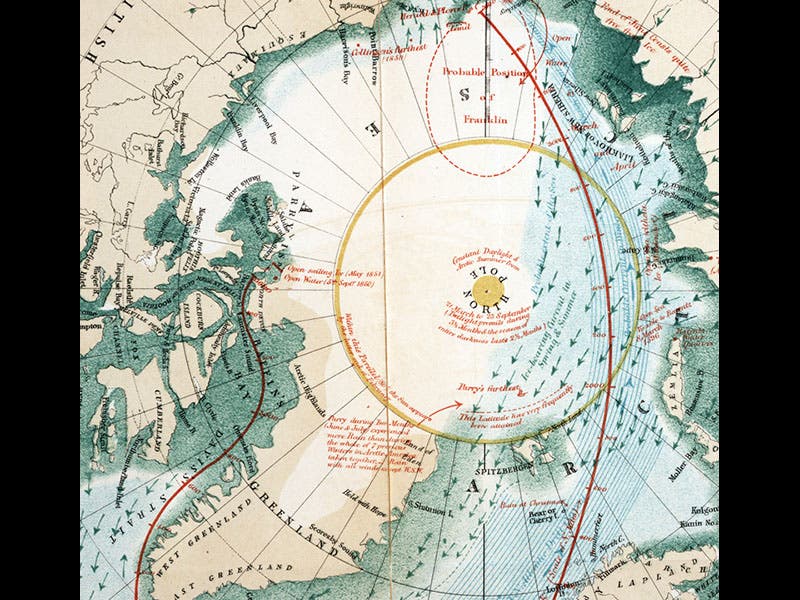 August Petermann, a German cartographer, was born Apr. 18, 1822. Petermann was a skilled map maker who came to Scotland in 1845 to assist the English map maker A.K. Johnston produce his atlas (Johnston had permission to translate into English the thematic atlas of Heinrich Berghaus, a German cartographer with whom Petermann trained, and Johnston no doubt found Petermann invaluable in translating the maps and redrawing them). Petermann then moved to London at about the time that the Franklin expedition to the Arctic got lost and the Admiralty sent dozens of ship to the rescue; when each expedition returned, there were maps to make.  He published a colored map of the supposed “Open Polar Sea” in 1852 (detail, first image), which we displayed in our 2008 exhibition, Ice: A Victorian Romance.