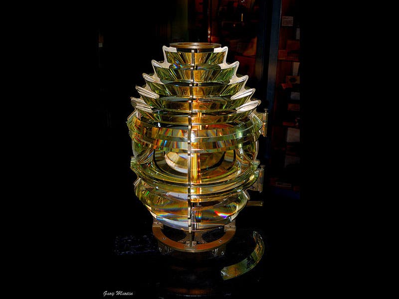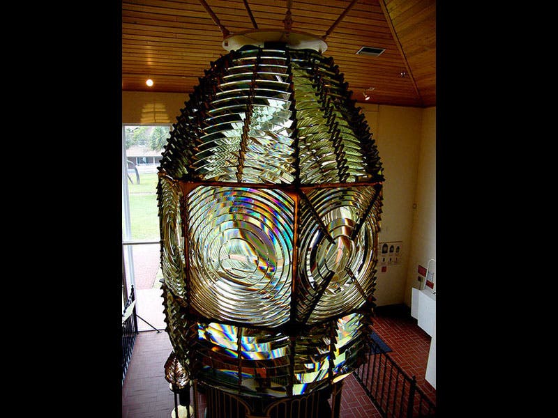 Augustin-Jean Fresnel, a French physicist and mathematician, was born May 10, 1788. Fresnel’s name is well-known to physicists because of his theoretical work in optics, but his greatest impact may have come from a practical device he invented, the Fresnel lens. Fresnel was asked by the French government to find some way to make lighthouses more efficient. A typical lighthouse of the day would have a kerosene flame and some sort of lens and reflector system to direct the light out to sea, but most of the light was lost, and beams were very faint. So Fresnel came up with a lens that looks like a multi-sided crystal barrel, surmounted with an elaborate crown of prisms. It was so designed that nearly every ray of light from the source is re-directed out on a horizontal path. The first Fresnel lens was installed in France in 1823, and by the 1850s they were in use everywhere. Fresnel lenses are ranked in “orders” of first through sixth; a first-order lens, the largest in ordinary use, is about 12 feet high and 7 feet wide, and sends out a beam that can be seen for over twenty miles. There are only about a dozen first-order Fresnel lenses left in the United States; each is worth millions of dollars. In our opinion, they are the most beautiful cut-glass objects ever made.