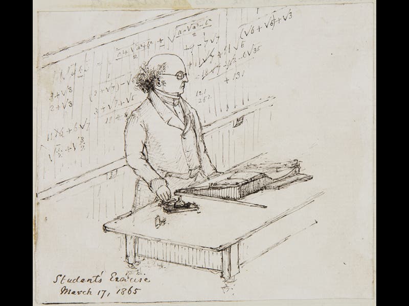 De Morgan does not seem to have had much use for scientific societies--he never became a fellow of the Royal Society, for example--but he did agree to take on the presidency of the London Mathematical Society, when it was founded in 1865, and he designed a logo for the Society, consisting of an image of Euclid, the motto Vis unita fortior (a united force is stronger) and the three numbers: 1865, 5625, and 1281. The numbers represent the Society’s founding date in the Christian, Jewish, and Muslim calendars. Such an ecumenical attitude toward other religions is a wonder to behold, since it was practically unheard of in Victorian England.  Several years ago UCL organized an exhibition to celebrate the 150th anniversary of the Society, and they displayed a sketch of Autustus’ logo, drawn by his wife Sophia (third image), as well as a contemporary sketch of De Morgan in the lecture hall, made by a student (first image). The Society still meets in the De Morgan House on Russell Square (fourth image).  Our other image shows a carte de visite of about the same time, 1865 (second image).