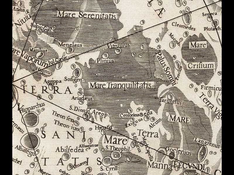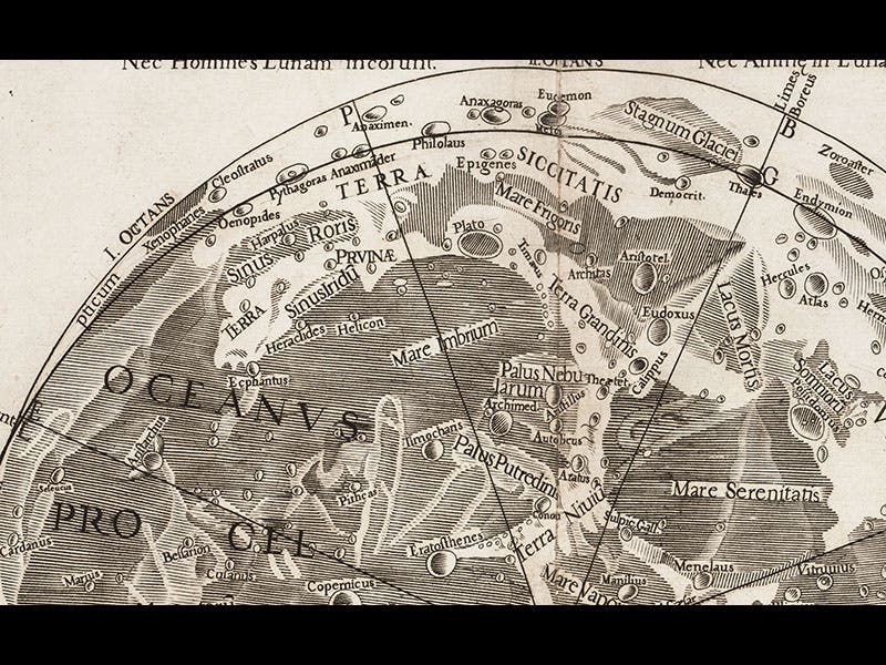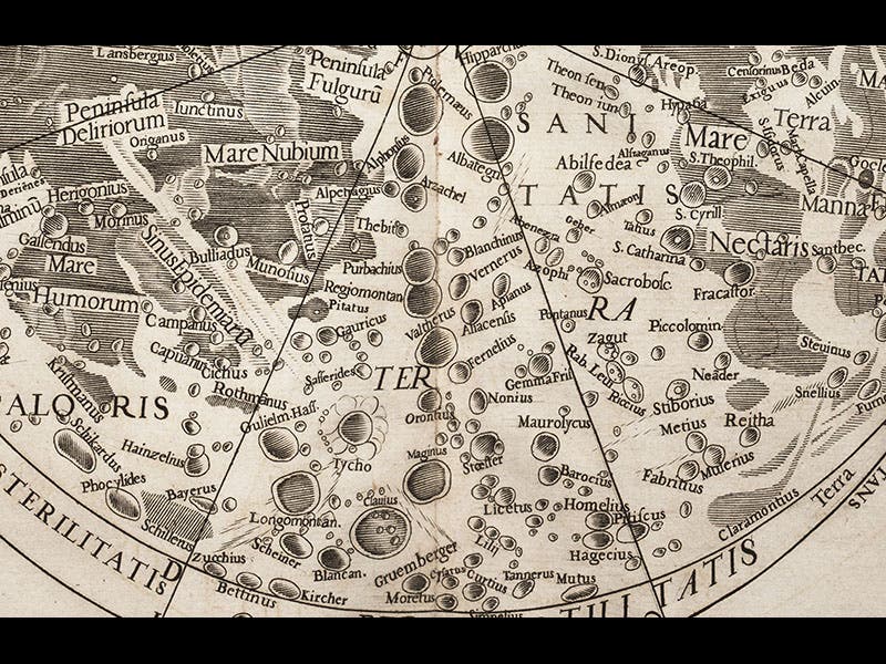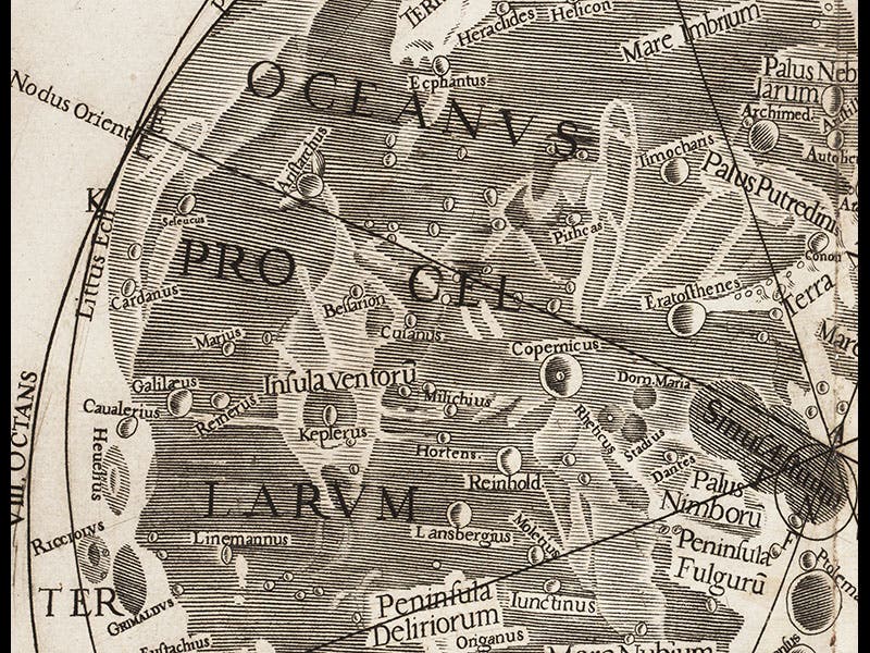 Riccioli chose to name the craters on the moon after people, such as Plato and Tycho (second image), and to call the dark, sea-like areas after moods or meteorological phenomena, offering us Oceanus Procellarum and Mare Tranquilitatis (the Ocean of Storms and the Sea of Tranquility) (third image). Oddly, Riccioli rewarded Copernicus and his followers, such as Kepler, with very prominent craters in the Ocean of Storms. Riccioli even placed his own crater, Ricciolus, near the Copernicans (fifth image), instead of with the other Jesuits surrounding the crater Tycho (fourth image), suggesting that perhaps he was more sympathetic to heliocentrism than he should have been. We featured the Riccioli/ Grimaldi map in our exhibition, The Face of the Moon: Galileo to Apollo.